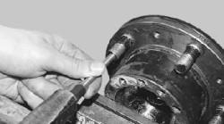 14. Для замены болта ступицы зафиксируйте ступицу в тисках и выпрессуйте болты. Запрессуйте новый болт легкими ударами молотка по его головке.