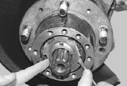 5. Удерживая ступицу колеса от проворачивания монтажной лопаткой, выверните шесть болтов крепления муфты отключения колеса…